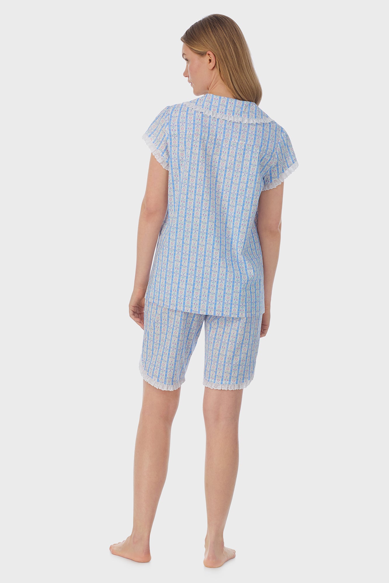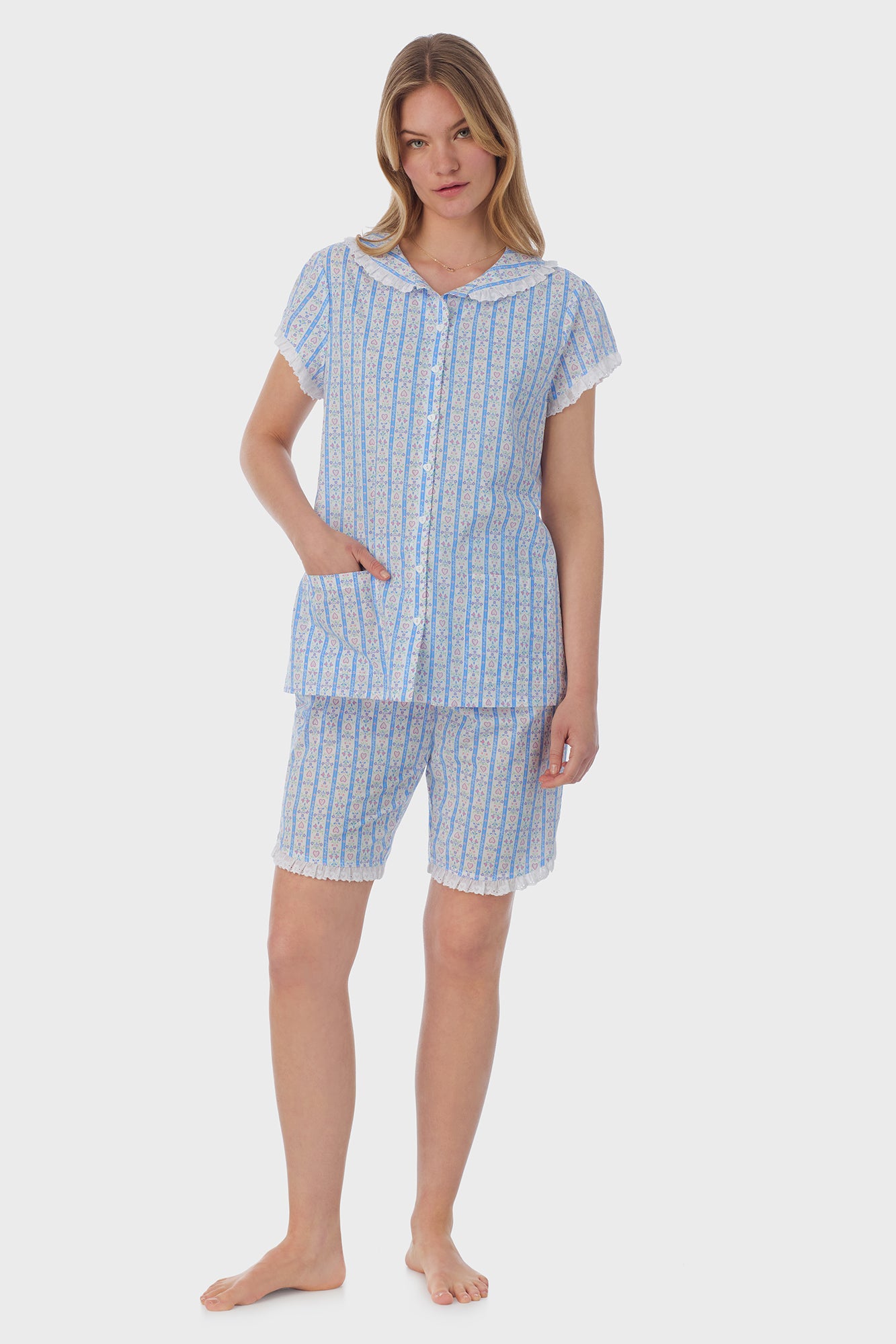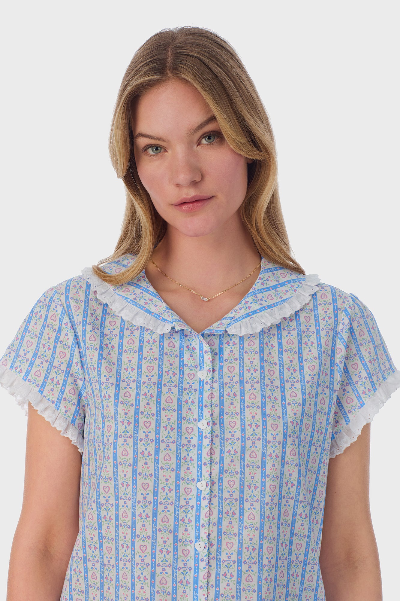 Our Iconic Heart Tyrolean print in Pastel Blue with Pink hearts to wear all year long. Made in fine 100% Cotton Woven Lawn with fresh white Heart Eyelet lace details.