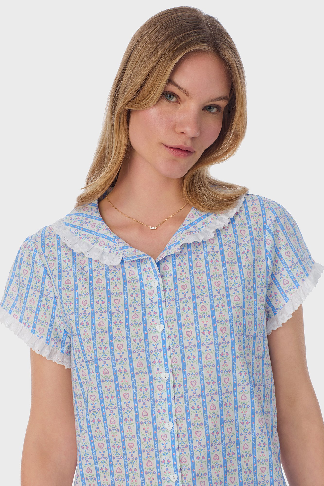 Our Iconic Heart Tyrolean print in Pastel Blue with Pink hearts to wear all year long. Made in fine 100% Cotton Woven Lawn with fresh white Heart Eyelet lace details.